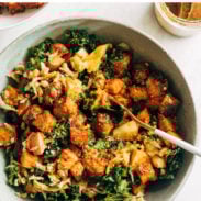 This bowl is great! I made extra sweet potatoes and had tons for leftovers. That marinade/dressing is addictive. I subbed the kale for some fresh chopped rainbow chard, stems in, and added the apple, quinoa, and pumpkin seeds. I will definitely make this again!
