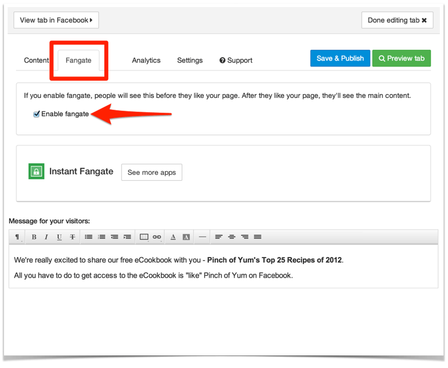 We’re starting by focusing on building the Pinch of Yum Facebook page. The first thing we’re doing to help build momentum with Facebook is offering a free product to those that “like” Pinch of Yum on Facebook. This type of incentive is called a fangate. You must become a fan in order to walk through the gate and access the product. The product is an eCookbook called Pinch of Yum’s Top 25 Recipes of 2012. It’s a collection of the most popular recipes from last year. You can check out what it looks like by visiting the fangate page on Pinch of Yum’s Facebook page.